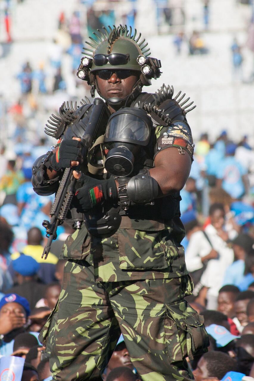 WOULDN’T MESS World’s scariest bodyguard kitted out with bizarre spiked jacket, gas mask, assault rifle and two pairs of sunglasses at Malawi president’s swearing in ceremony