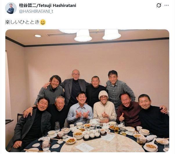 ラモス瑠偉氏、福田正博氏、井原正巳氏ら総勢10人で円卓を囲んだ食事会。柱谷氏は「楽しいひととき」とつづり、参加者全員が穏やかな笑みを浮かべている。